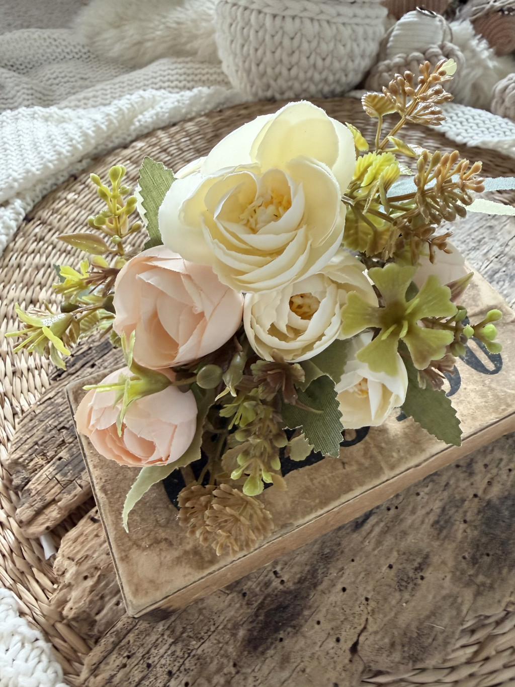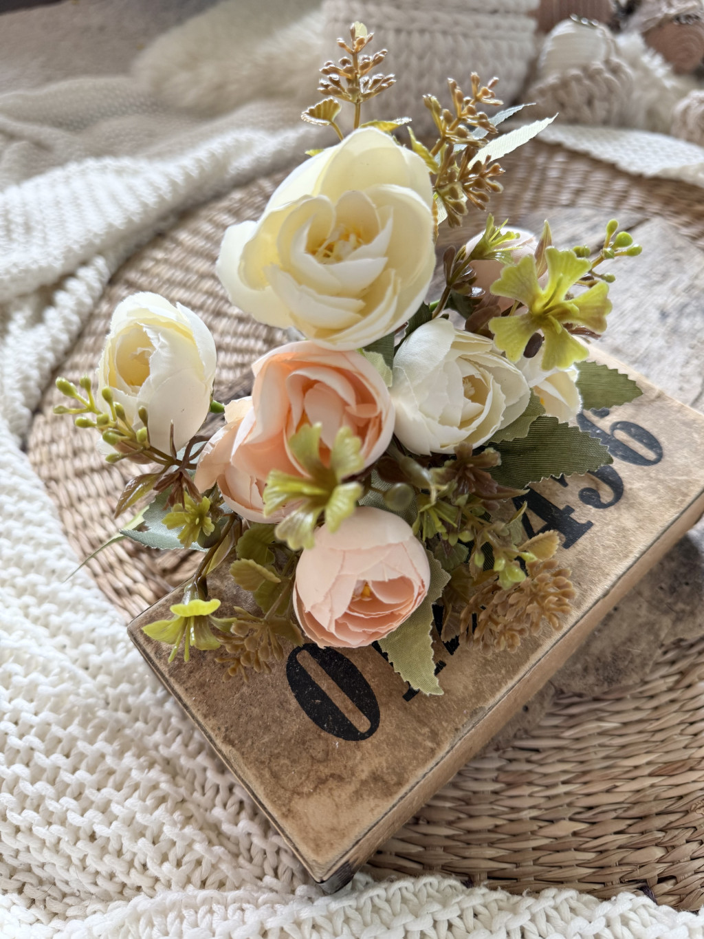 Mű Boglárka levéllel 5 ág 8 fej virággal, kiegészítőkkel  - Krém-barackvirág